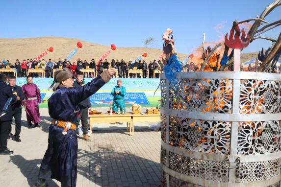 随着圣火的点燃,仪式正式开始。蒙古马队、骆驼托运队浩浩荡荡入场,悠扬的古如歌、江格尔在杭锦大地上空回荡,蒙古族德高望重的长者手持银碗,把奶食、黄油涂抹在“五畜”的头部,表达了对赖以生存牲畜的祝福和期盼。剪马鬃、烙马印、剪驼绒毛、圣火祈福、五畜阉割、五畜祝颂等民俗活动无不寄托着草原儿女的美好祝愿。